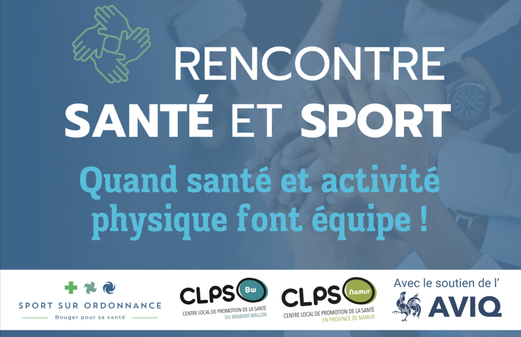 L’ASBL Sport sur Ordonnance a le plaisir de vous inviter à une journée de rencontre consacrée aux liens entre activité physique et santé, organisée en collaboration avec les Centres Locaux de Promotion de la Santé (CLPS) du Brabant wallon et de Namur.